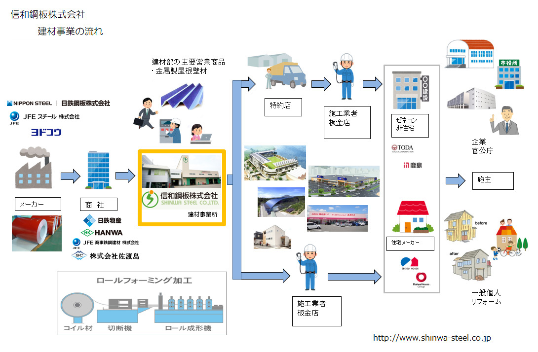 の板を加工・販売する鋼板事業と、建物に使われる材料を扱う建材事業の2つの柱で、ものづくりや建設の現