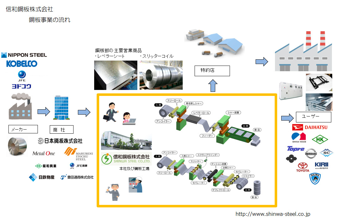 信和鋼板は、「鋼板 (こうはん)」と呼ばれる薄い鉄 (0.27mm~4.5mm)